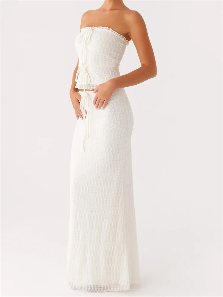 Women Summer Outfits Solid Colors Crop Drawstring Bandeau and Elastic Long Skirt Set for Streetwear Aesthetic Clothes